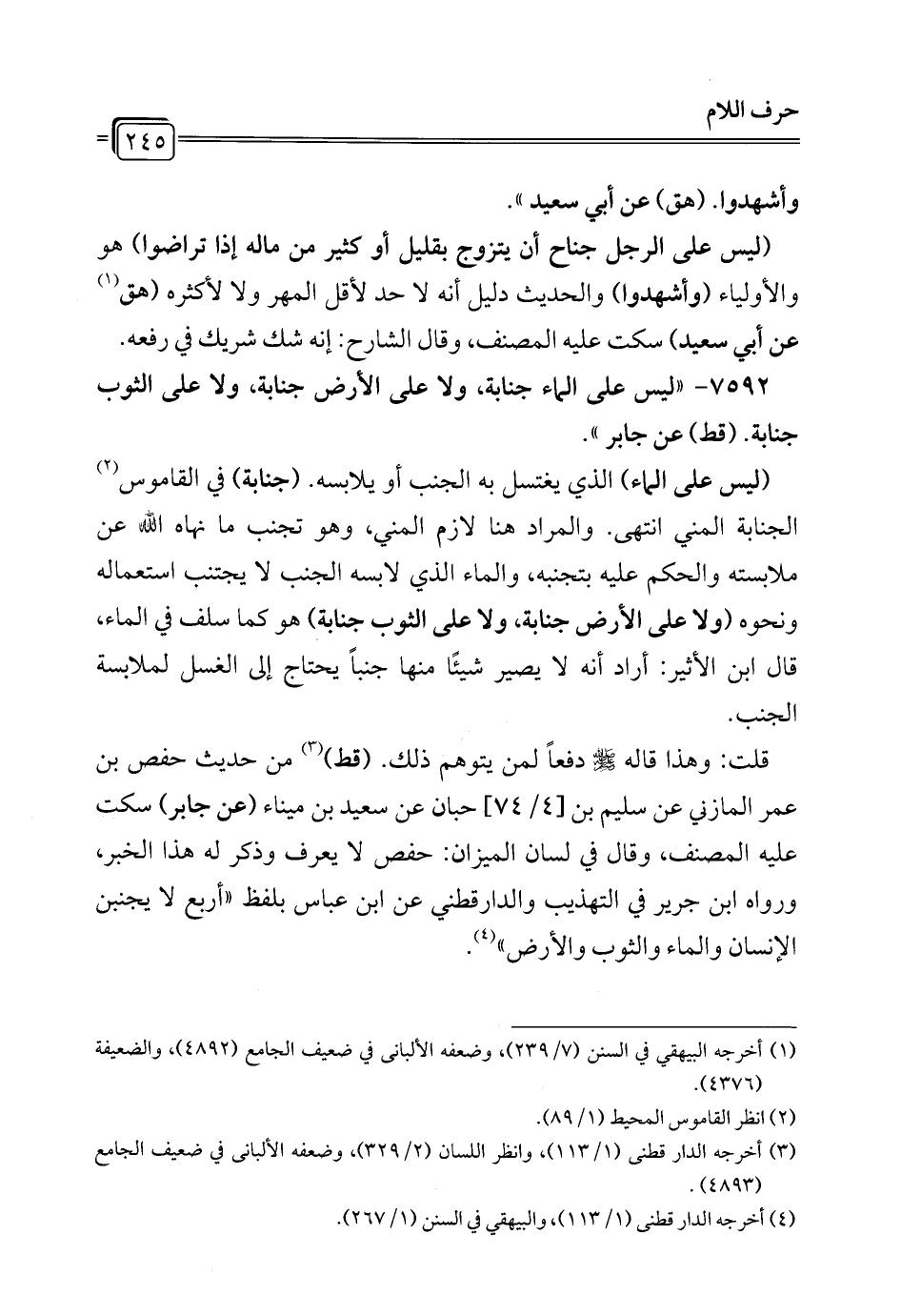 7592 - "ليس على الماء جنابة، ولا على الأرض جنابه، ولا على الثوب جنابة. (قط) عن جابر".