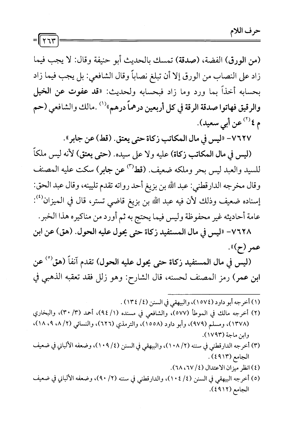 7628 - "ليس في مال المستفيد زكاة حتى يحول عليه الحول. (هق) عن ابن عمر (ح) ".