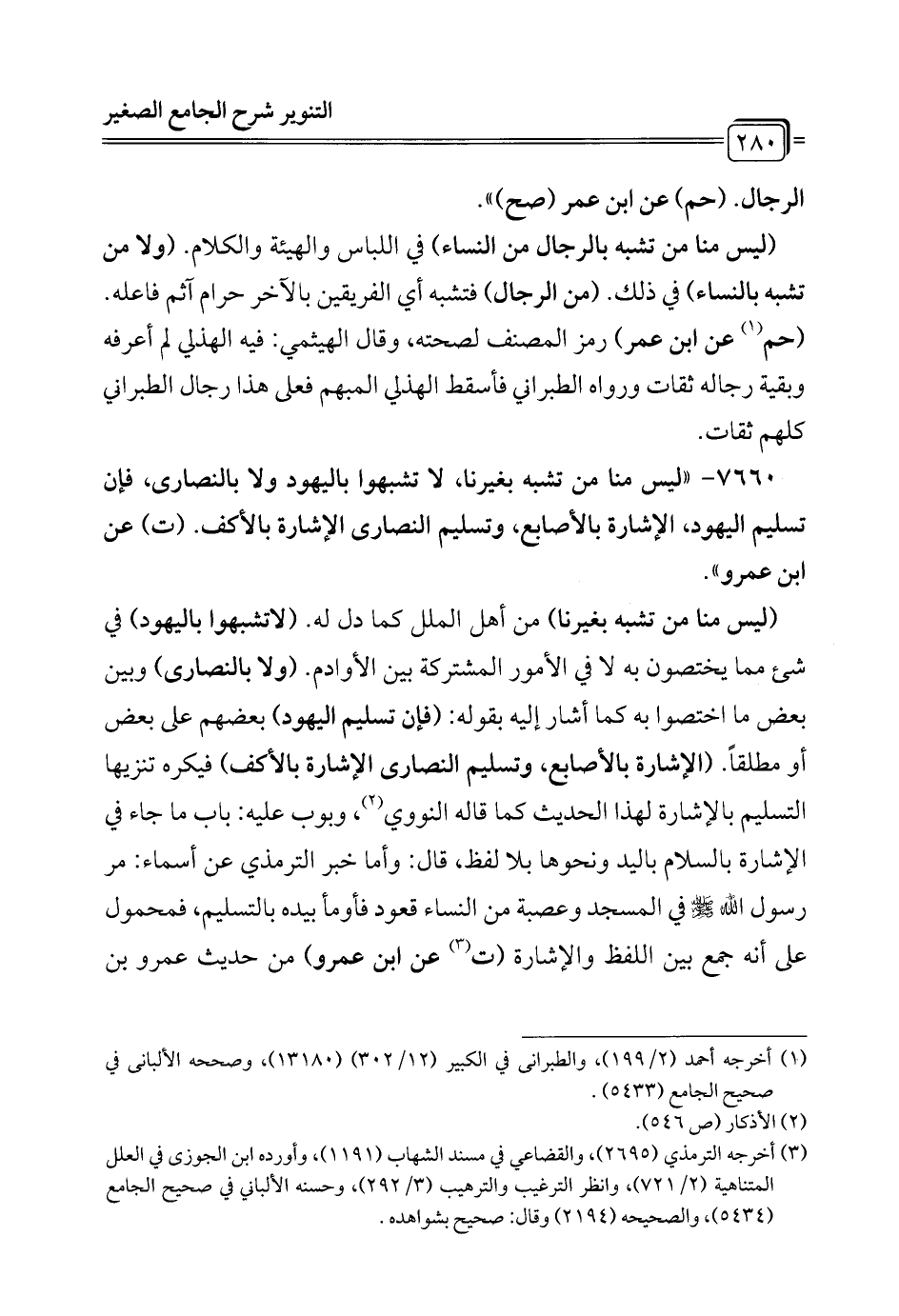 7660 - "ليس منا من تشبه بغيرنا، لا تشبهوا باليهود ولا بالنصارى، فإن تسليم اليهود، الإشارة بالأصابع، وتسليم النصارى الإشارة بالأكف. (ت) عن ابن عمرو".