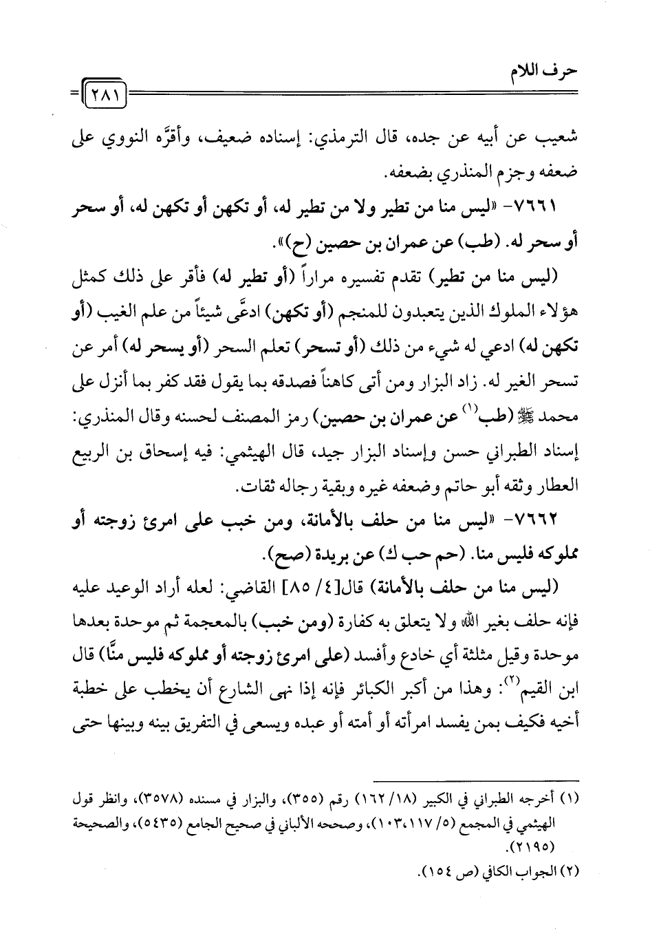 7661 - "ليس منا من تطير ولا من تطير له، أو تكهن أو تكهن له، أو سحر أو سحر له. (طب) عن عمران بن حصين (ح) ".