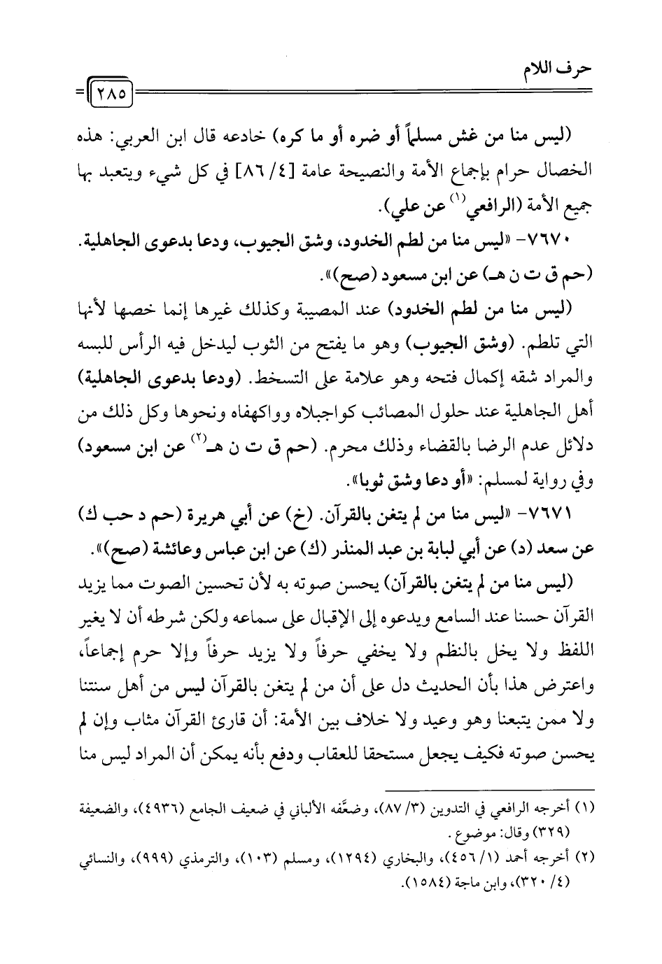 7671 - "ليس منا من لم يتغن بالقرآن. (خ) عن أبي هريرة (حم د حب ك) عن سعد (د) عن أبي لبابة بن عبد المنذر (ك) عن ابن عباس وعائشة (صح) ".