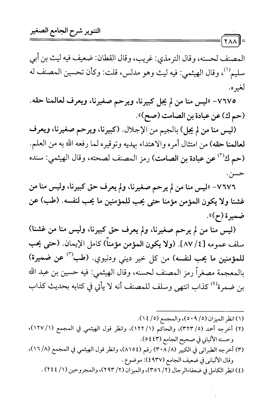 7675 - "ليس منا من لم يجل كبيرنا، ويرحم صغيرنا، ويعرف لعالمنا حقه. (حم ك) عن عبادة بن الصامت (صح) ".