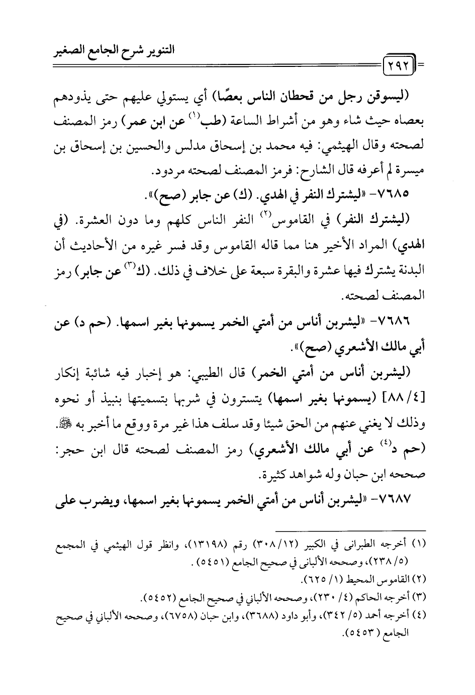 (ليشربن أناس من أمتي الخمر) قال الطيبي: هو إخبار فيه شائبة إنكار [4/ 88] (يسمونها بغير اسمها) يتسترون في شربها بتسميته بنبيذ أو نحوه وذلك لا يغني عنهم من الحق شيئا وقد سلف هذا غير مرة ووقع ما أخبر به - صلى الله عليه وسلم -. (حم د (¬4) عن أبي مالك الأشعري) رمز المصنف لصحته قال ابن حجر: صححه ابن حبان وله شواهد كثيرة.