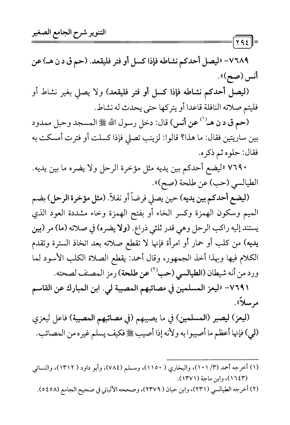 7689 - "ليصل أحدكم نشاطه فإذا كسل أو فتر فليقعد. (حم ق د ن هـ) عن أنس (صح) ".