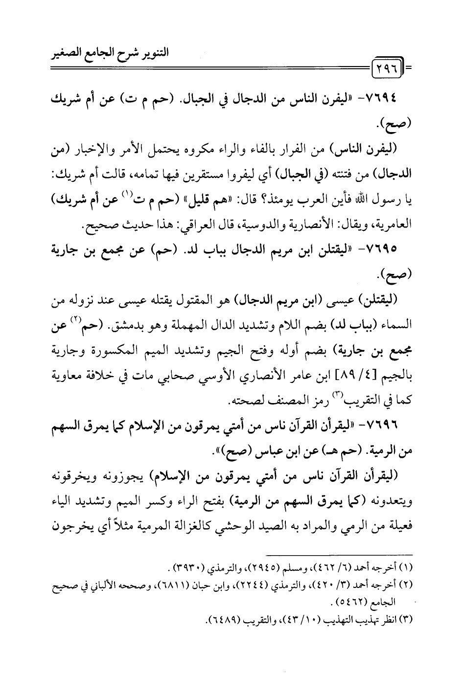 7696 - "ليقرأن القرآن ناس من أمتي يمرقون من الإِسلام كما يمرق السهم من الرمية. (حم هـ) عن ابن عباس (صح) ".
