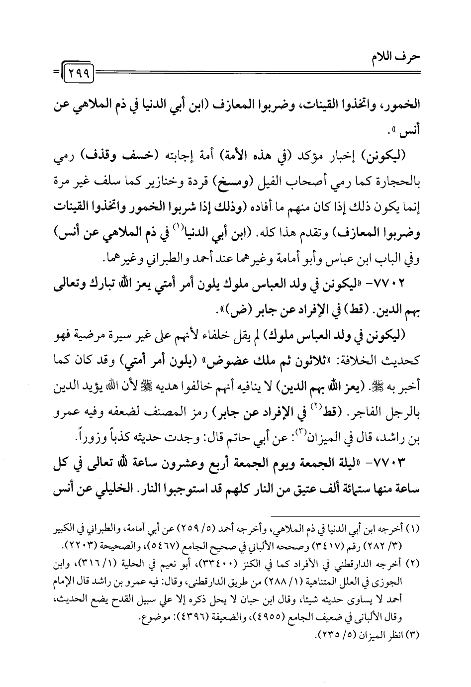 7702 - "ليكونن في ولد العباس ملوك يلون أمر أمتي يعز الله تبارك وتعالى بهم الدين. (قط) في الإفراد عن جابر (ض) ".