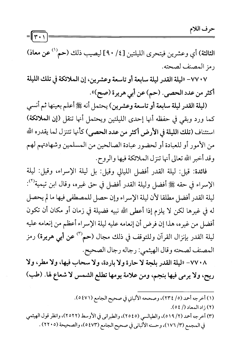 7707 - "ليلة القدر ليلة سابعة أو تاسعة وعشرين، إن الملائكة في تلك الليلة أكثر من عدد الحصى. (حم) عن أبي هريرة (صح) ".