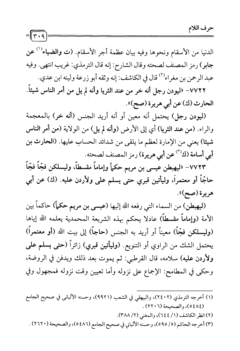 7723 - "ليهبطن عيسى بن مريم حكماً وإماماً مقسطاً، وليسلكن فجًّا فجًّا حاجًّا أو معتمرًا، وليأتين قبري حتى يسلم على ولأردن عليه. (ك) عن أبي هريرة (صح) ".