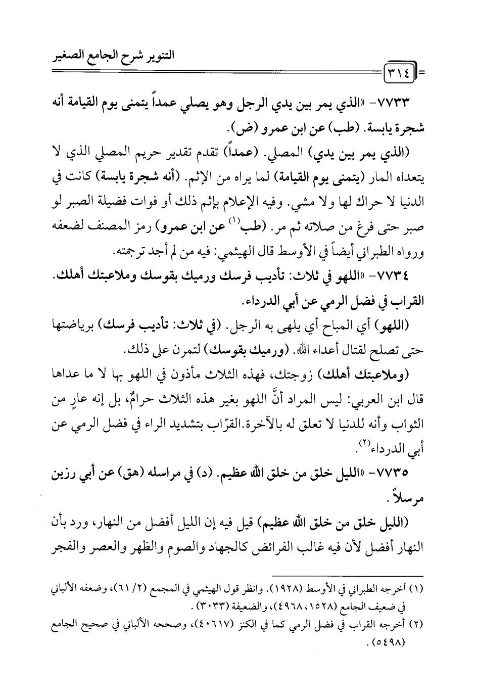 7733 - "الذي يمر بين يدي الرجل وهو يصلي عمداً يتمنى يوم القيامة أنه شجرة يابسة. (طب) عن ابن عمرو (ض).