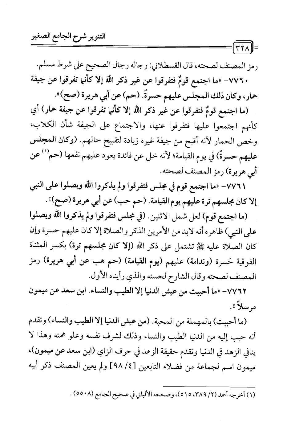 7760 - "ما اجتمع قومٌ فتفرقوا عن غير ذكر الله إلا كأنما تفرقوا عن جيفة حمار، وكان ذلك المجلس عليهم حسرةً. (حم) عن أبي هريرة (صح) ".