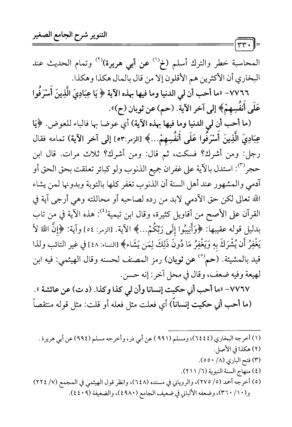 7767 - "ما أحب أني حكيت إنسانا وأن لي كذا وكذا. (د ت) عن عائشة".