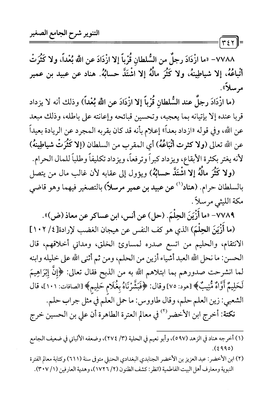 7788 - "ما ازْدَادَ رجلٌ من السُّلطانِ قُرْباً إلا ازْدَادَ عن الله بُعْداً، ولا كَثُرَتْ أتْباعُهُ، إلا شياطِينهُ، ولا كَثُرَ مالُهُ إلا اشْتَدَّ حسابُهُ. هناد عن عبيد بن عمير مرسلاً".