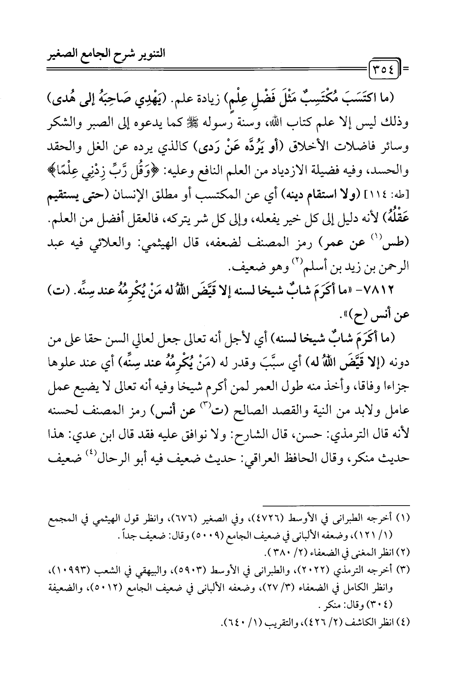 7812 - "ما أكَرَمَ شابٌّ شيخا لسنه إلا قَيَّضَ الله له مَنْ يُكْرِمُهُ عند سِنِّه. (ت) عن أنس (ح) ".