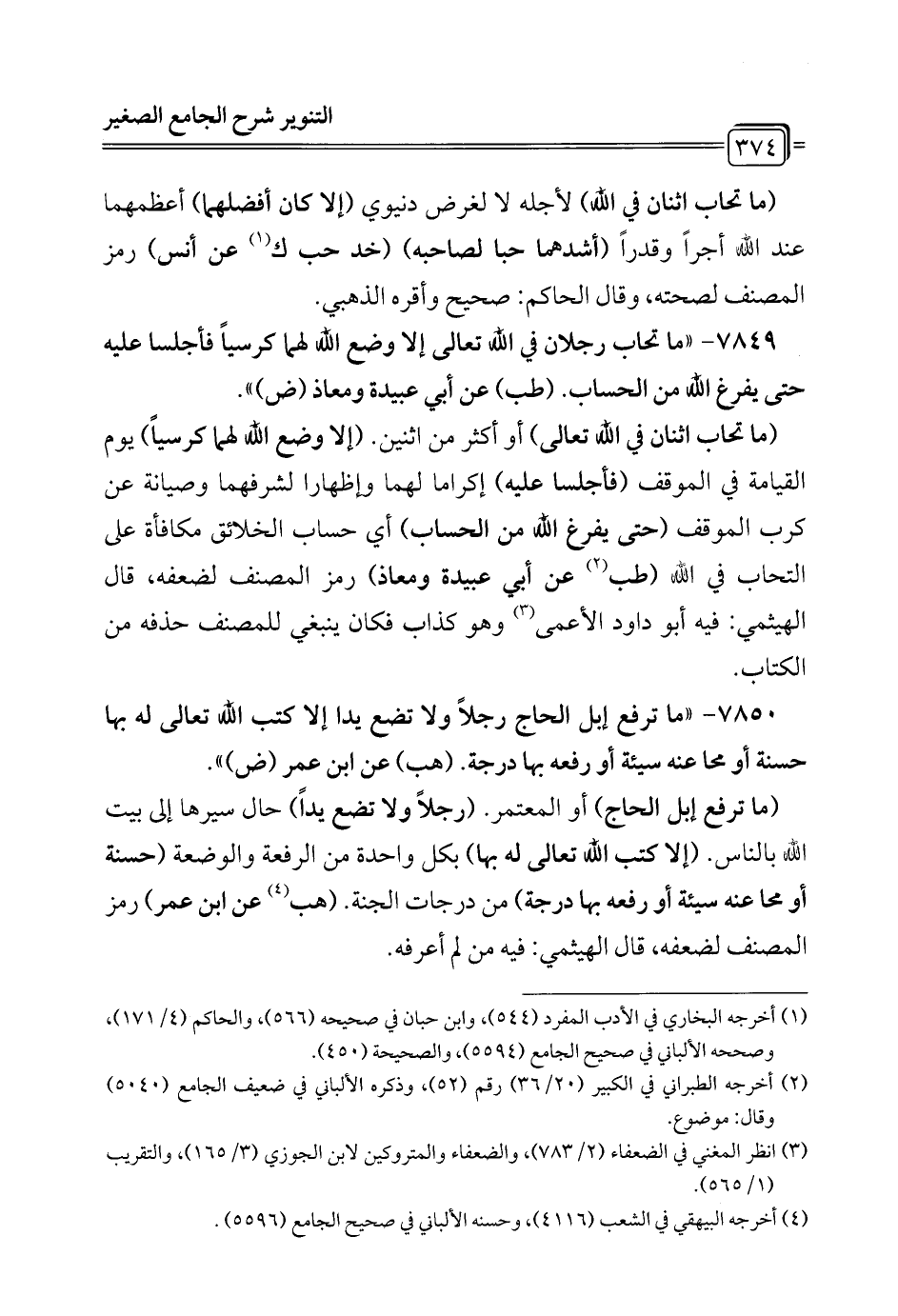 7849 - "ما تحاب رجلان في الله تعالى إلا وضع الله لهما كرسياً فأجلسا عليه حتى يفرغ الله من الحساب. (طب) عن أبي عبيدة ومعاذ (ض) ".