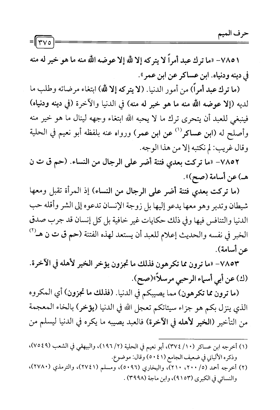 7852 - "ما تركت بعدي فتنة أضر على الرجال من النساء. (حم ق ت ن هـ) عن أسامة (صح) ".
