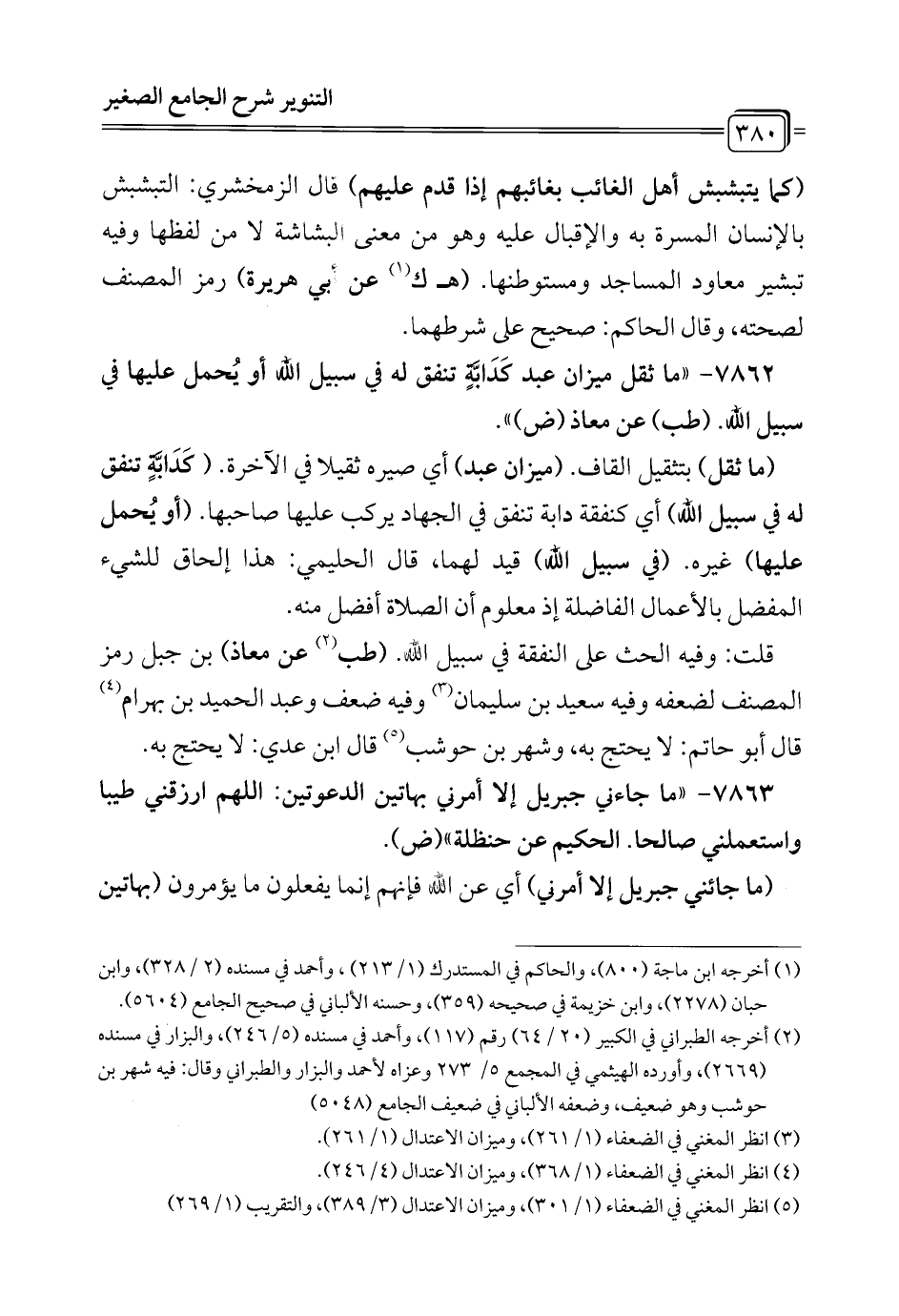 7862 - "ما ثقل ميزان عبد كَدَابَّةٍ تنفق له في سبيل الله أو يُحمل عليها في سبيل الله. (طب) عن معاذ (ض) ".