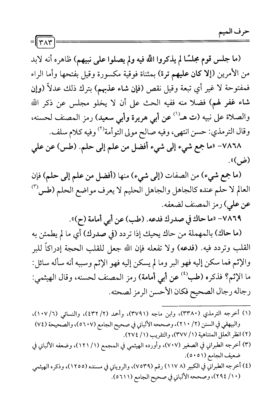 7868 - "ما جمع شيء إلى شيء أفضل من علم إلى حلم. (طس) عن علي (ض) ".