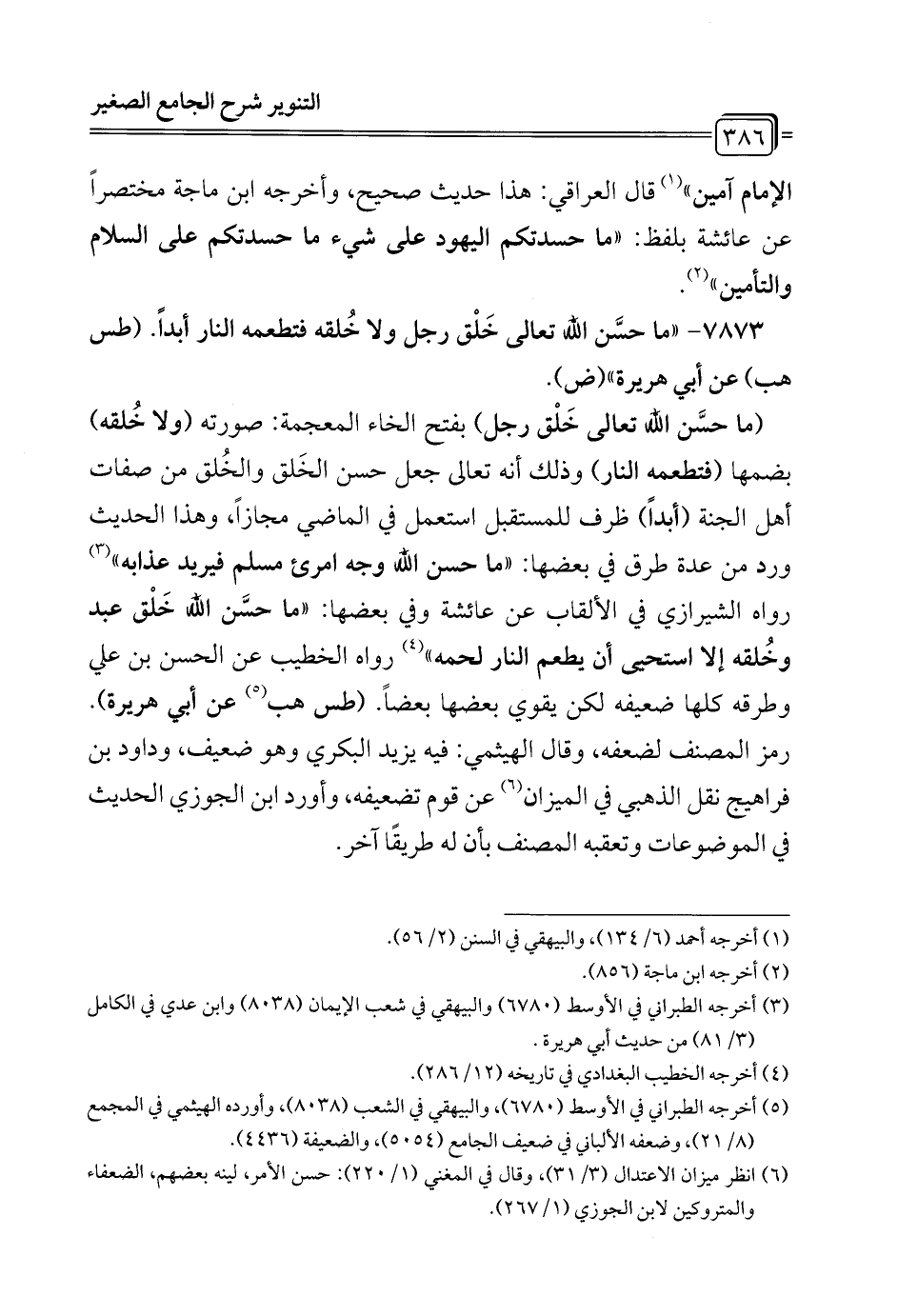 7873 - "ما حسَّن الله تعالى خَلْق رجل ولا خُلقه فتطعمه النار أبداً. (طس هب) عن أبي هريرة" (ض).