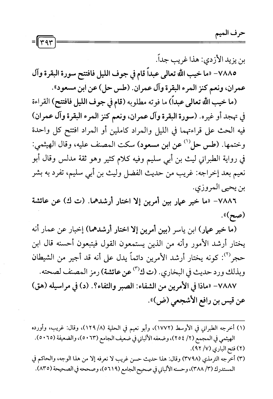7885 - "ما خيب الله تعالى عبداً قام في جوف الليل فافتتح سورة البقرة وآل عمران، ونعم كنز المرء البقرة وآل عمران. (طس حل) عن ابن مسعود".