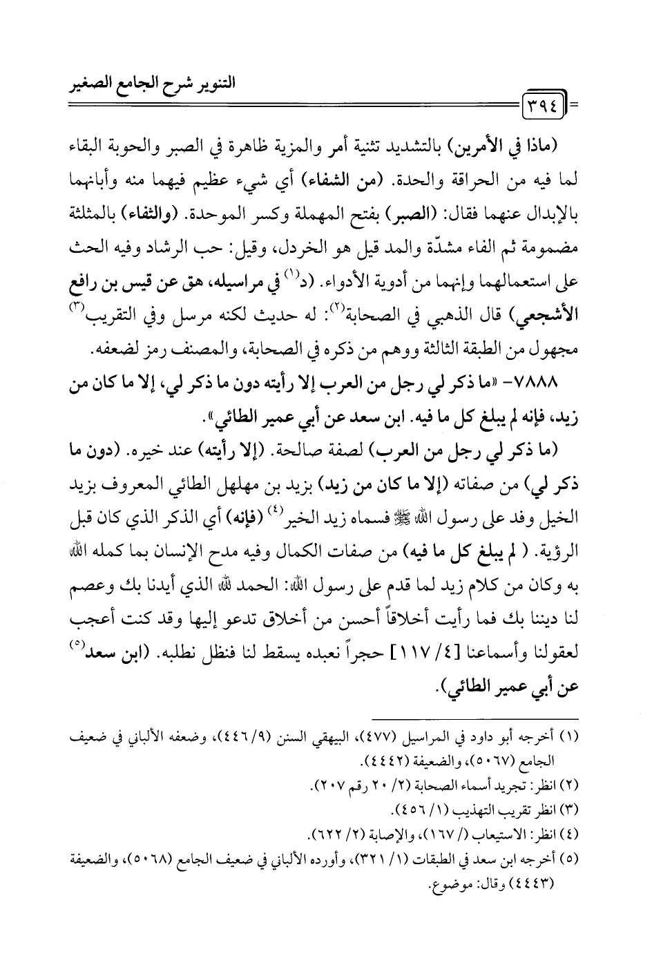 7888 - "ما ذكر لي رجل من العرب إلا رأيته دون ما ذكر لي، إلا ما كان من زيد، فإنه لم يبلغ كل ما فيه. ابن سعد عن أبي عمير الطائي".