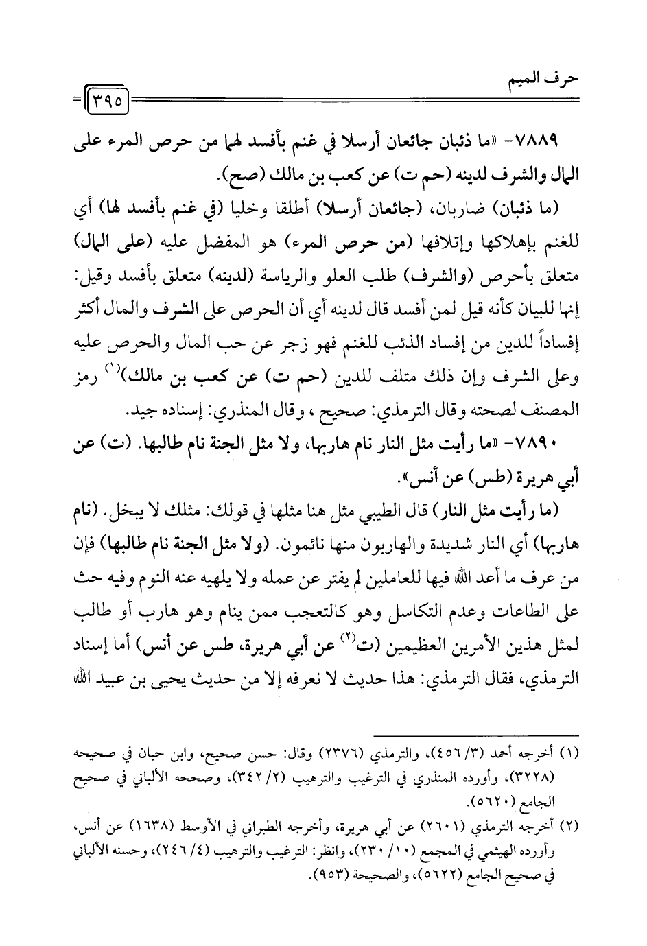 7889 - "ما ذئبان جائعان أرسلا في غنم بأفسد لهما من حرص المرء على المال والشرف لدينه (حم ت) عن كعب بن مالك (صح).