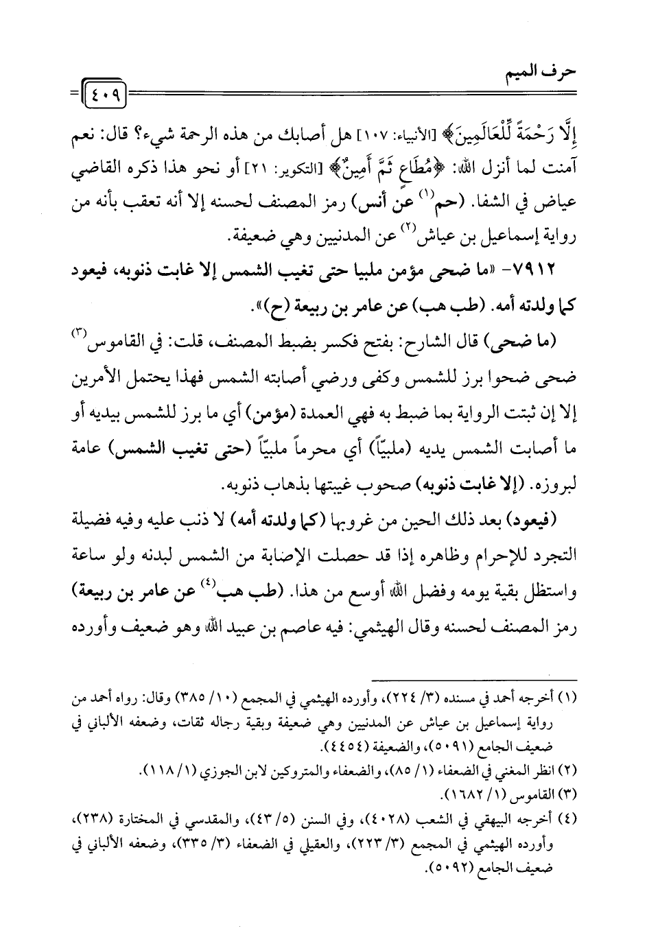 7912 - "ما ضحى مؤمن ملبيا حتى تغيب الشمس إلا غابت ذنوبه, فيعود كما ولدته أمه. (طب هب) عن عامر بن ربيعة (ح) ".