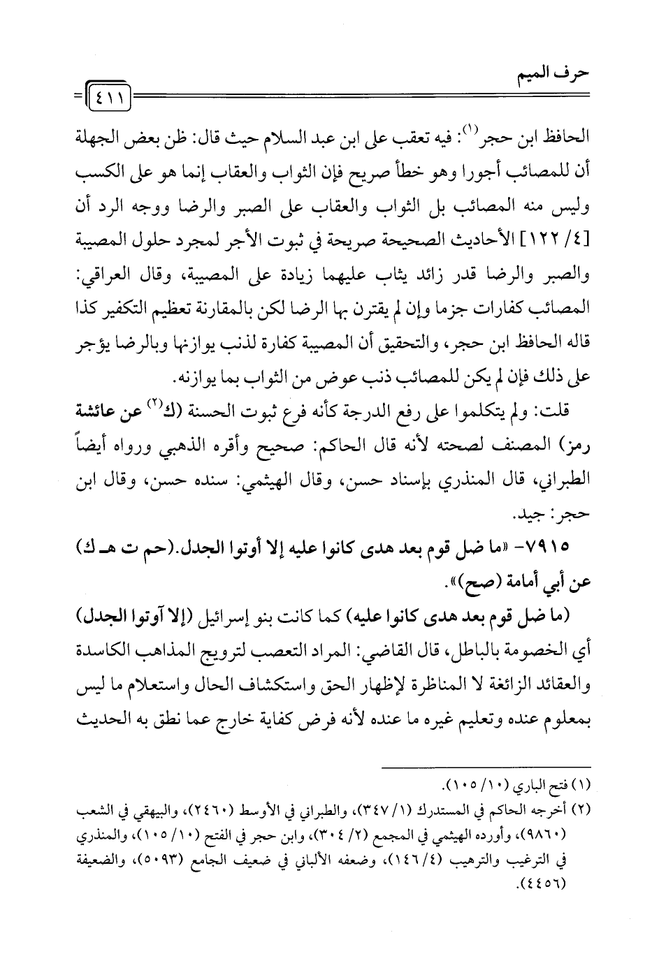 7915 - "ما ضل قوم بعد هدى كانوا عليه إلا أوتوا الجدل. (حم ت هـ ك) عن أبي أمامة (صح) ".