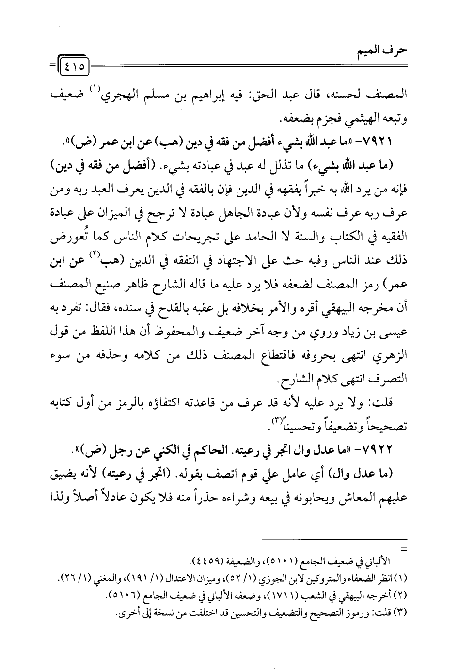 7921 - "ما عبد الله بشيء أفضل من فقه في دين (هب) عن ابن عمر (ض) ".