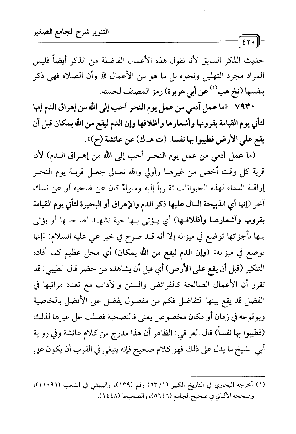 7930 - "ما عمل آدمي من عمل يوم النحر أحب إلى الله من إهراق الدم إنها لتأتي يوم القيامة بقرونها وأشعارها وأظلافها وإن الدم ليقع من الله بمكان قبل أن يقع علي الأرض فطيبوا بها نفسا. (ت هـ ك) عن عائشة (ح) ".