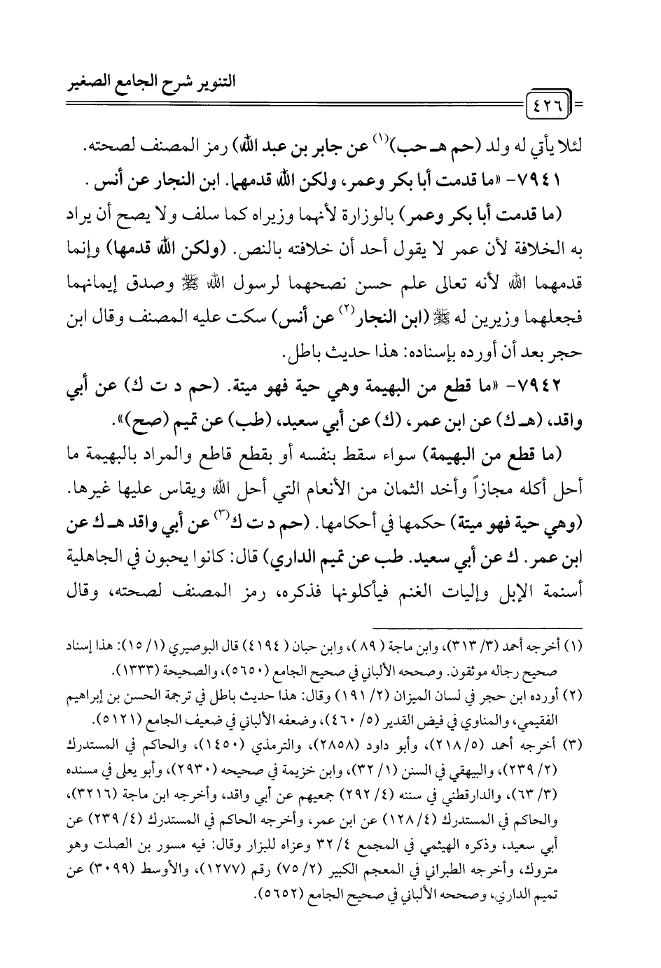 7942 - "ما قطع من البهيمة وهي حية فهو ميتة. (حم د ت ك) عن أبي واقد، (هـ ك) عن ابن عمر، (ك) عن أبي سعيد، (طب) عن تميم (صح) ".