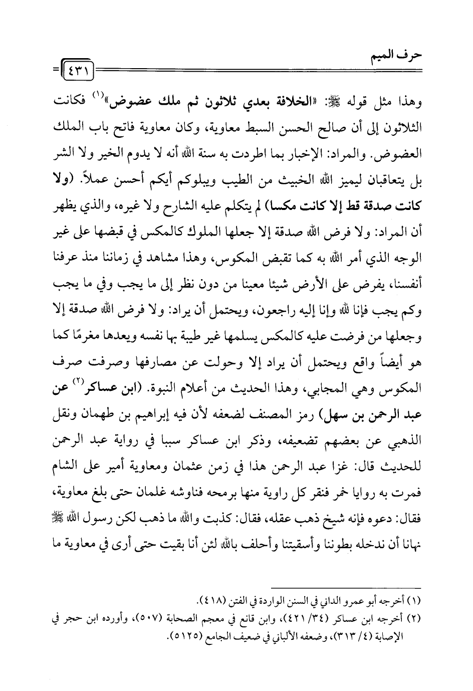 وهذا مثل قوله - صلى الله عليه وسلم -: "الخلافة بعدي ثلاثون ثم ملك عضوض" (¬1) فكانت الثلاثون إلى أن صالح الحسن السبط معاوية، وكان معاوية فاتح باب الملك العضوض. والمراد: الإخبار بما اطردت به سنة الله أنه لا يدوم الخير ولا الشر بل يتعاقبان ليميز الله الخبيث من الطيب ويبلوكم أيكم أحسن عملاً. (ولا كانت صدقة قط إلا كانت مكسا) لم يتكلم عليه الشارح ولا غيره، والذي يظهر أن المراد: ولا فرض الله صدقة إلا جعلها الملوك كالمكس في قبضها على غير الوجه الذي أمر الله به كما تقبض المكوس، وهذا مشاهد في زماننا منذ عرفنا أنفسنا، يفرض على الأرض شيئاً معينا من دون نظر إلى ما يجب وفي ما يجب وكم يجب فإنا لله وإنا إليه راجعون، ويحتمل أن يراد: ولا فرض الله صدقة إلا وجعلها من فرضت عليه كالمكس يسلمها غير طيبة بها نفسه ويعدها مغرمًا كما هو أيضًا واقع ويحتمل أن يراد إلا وحولت عن مصارفها وصرفت صرف المكوس وهي المجابي، وهذا الحديث من أعلام النبوة. (ابن عساكر (¬2) عن عبد الرحمن بن سهل) رمز المصنف لضعفه لأن فيه إبراهيم بن طهمان ونقل الذهبي عن بعضهم تضعيفه، وذكر ابن عساكر سببا في رواية عبد الرحمن للحديث قال: غزا عبد الرحمن هذا في زمن عثمان ومعاوية أمير على الشام فمرت به روايا خمر فنقر كل راوية منها برمحه فناوشه غلمان حتى بلغ معاوية، فقال: دعوه فإنه شيخ ذهب عقله، فقال: كذبت والله ما ذهب لكن رسول الله - صلى الله عليه وسلم - نهانا أن ندخله بطوننا وأسقيتنا وأحلف بالله لئن أنا بقيت حتى أرى في معاوية ما