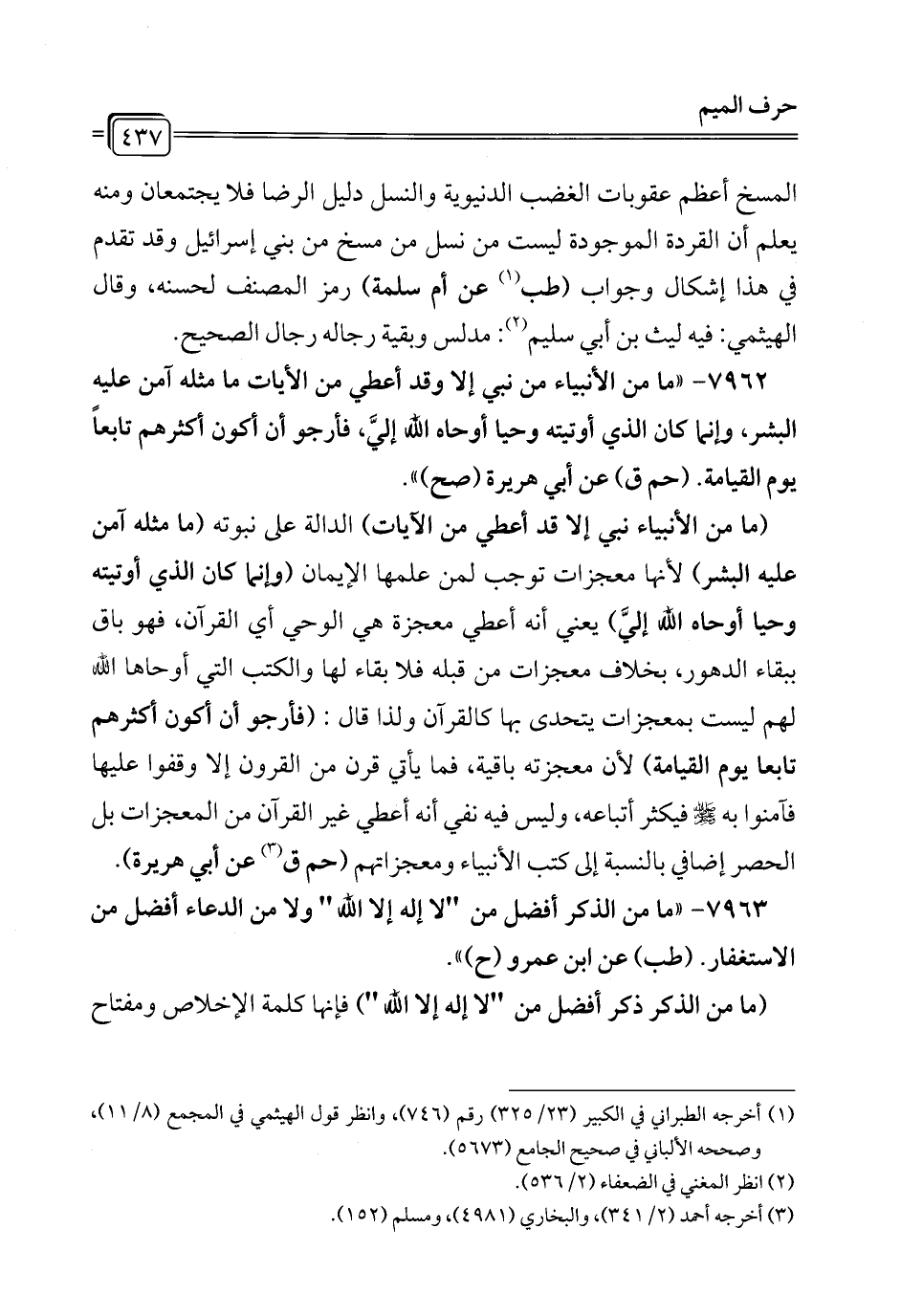7962 - "ما من الأنبياء من نبي إلا وقد أعطي من الآيات ما مثله آمن عليه البشر، وإنما كان الذي أوتيته وحيا أوحاه الله إليَّ، فأرجو أن أكلون أكثرهم تابعاً يوم القيامة. (حم ق) عن أبي هريرة (صح) ".