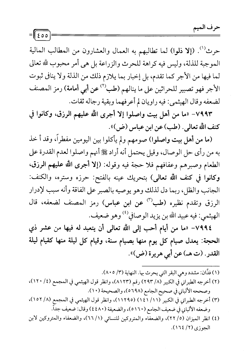 7994 - "ما من أيام أحب إلى الله تعالى أن يتعبد له فيها من عشر ذي الحجة: يعدل صيام كل يوم منها بصيام سنة، وقيام كل ليلة منها كقيام ليلة القدر. (ت هـ) عن أبي هريرة (ض) ".