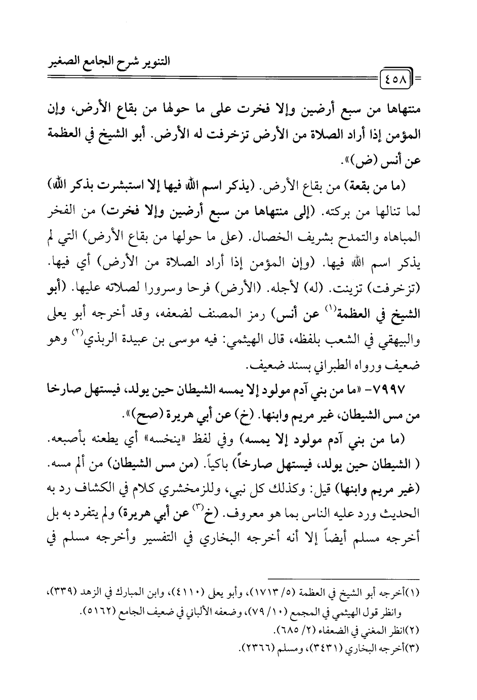 (ما من بقعة) من بقاع الأرض. (يذكر اسم الله فيها إلا استبشرت بذكر الله) لما تنالها من بركته. (إلى منتهاها من سبع أرضين وإلا فخرت) من الفخر المباهاه والتمدح بشريف الخصال. (على ما حولها من بقاع الأرض) التي لم يذكر اسم الله فيها. (وإن المؤمن إذا أراد الصلاة من الأرض) أي فيها. (تزخرفت) تزينت. (له) لأجله. (الأرض) فرحا وسرورا لصلاته عليها. (أبو الشيخ في العظمة (¬1) عن أنس) رمز المصنف لضعفه، وقد أخرجه أبو يعلى والبيهقي في الشعب بلفظه، قال الهيثمي: فيه موسى بن عبيدة الربذي (¬2) وهو ضعيف ورواه الطبراني بسند ضعيف.