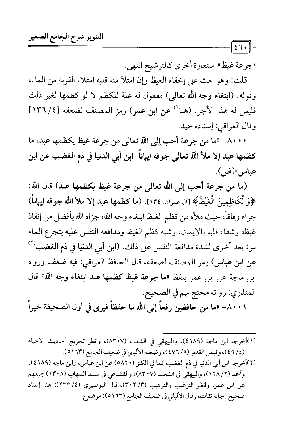 8000 - "ما من جرعة أحب إلى الله تعالى من جرعة غيظ يكظمها عبد، ما كظمها عبد إلا ملأ الله تعالى جوفه إيماناً. ابن أبي الدنيا في ذم الغضب عن ابن عباس" (ض).
