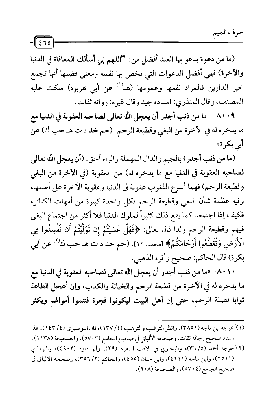 8009 - "ما من ذنب أجدر أن يعجل الله تعالى لصاحبه العقوبة في الدنيا مع ما يدخره له في الآخرة من البغي وقطيعة الرحم. (حم خد د ت هـ حب ك) عن أبي بكرة".