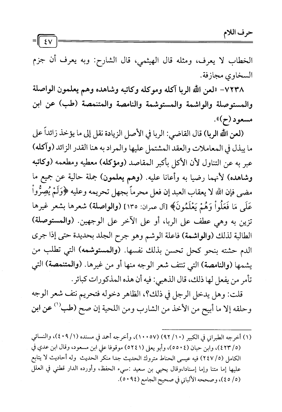 7238 - "لعن الله الربا آكله وموكله وكاتبه وشاهده وهم يعلمون الواصلة والمستوصلة والواشمة والمستوشمة والنامصة والمتنمصة (طب) عن ابن مسعود (ح) ".
