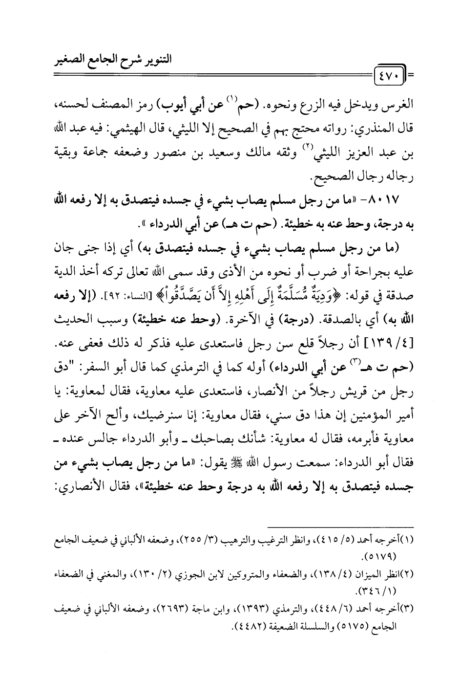 8017 - "ما من رجل مسلم يصاب بشيء في جسده فيتصدق به إلارفعه الله به درجة، وحط عنه به خطيئة. (حم ت هـ) عن أبي الدرداء".