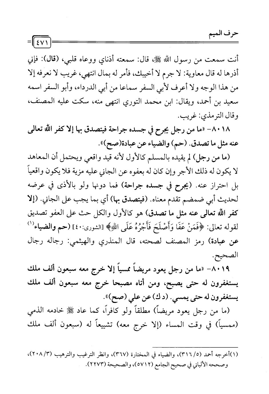 8019 - "ما من رجل يعود مريضاً ممسياً إلا خرج معه سبعون ألف ملك يستغفرون له حتى يصبح، ومن أتاه مصبحا خرج معه سبعون ألف ملك يستغفرون له حتى يمسي. (د ك) عن علي (صح) ".