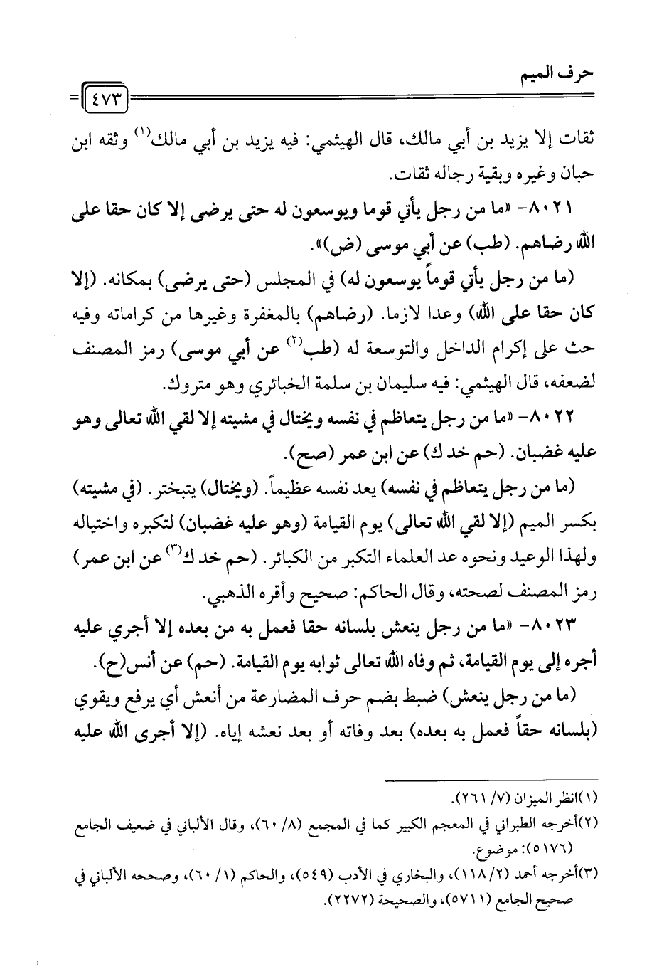 8022 - "ما من رجل يتعاظم في نفسه ويختال الذي مشيته إلا لقي الله تعالى وهو عليه غضبان. (حم خد ك) عن ابن عمر (صح).