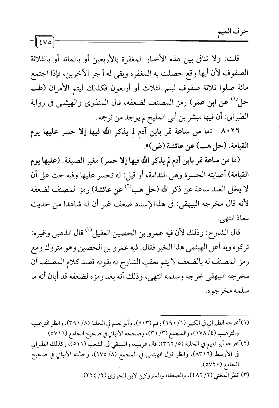 8026 - "ما من ساعة تمر بابن آدم لم يذكر الله فيها إلا حسر عليها يوم القيامة. (حل هب) عن عائشة (ض) ".