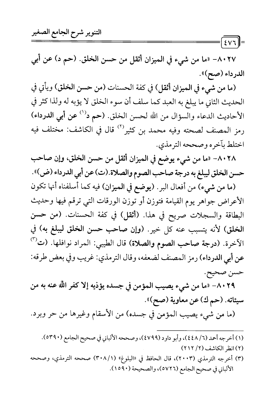 8028 - "ما من شيء يوضع في الميزان أثقل من حسن الخلق، وإن صاحب حسن الخلق ليبلغ به درجة صاحب الصوم والصلاة. (ت) عن أبي الدرداء (ض) ".