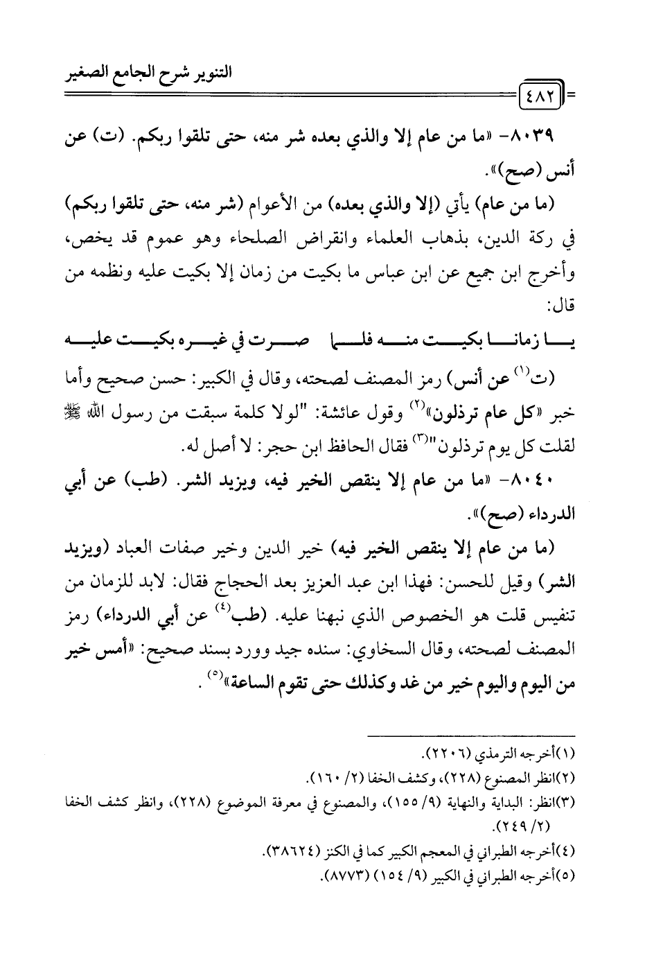 8039 - "ما من عام إلا والذي بعده شر منه، حتى تلقوا ربكم. (ت) عن أنس (صح) ".