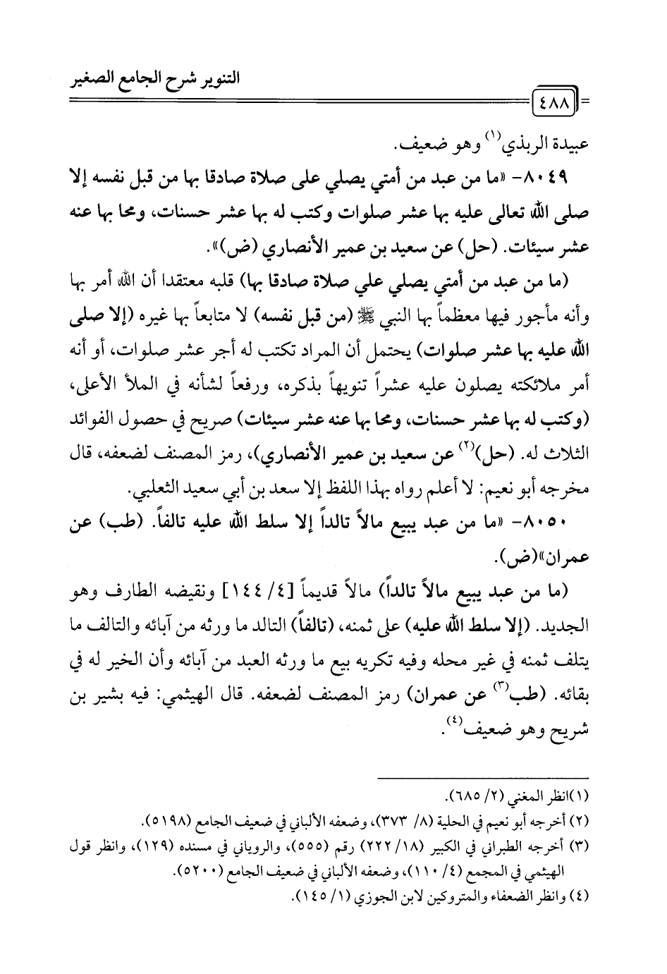 8049 - "ما من عبد من أمتي يصلي على صلاة صادقا بها من قبل نفسه إلا صلى الله تعالى عليه بها عشر صلوات وكتب له بها عشر حسنات، ومحا بها عنه عشر سيئات. (حل) عن سعيد بن عمير الأنصاري (ض) ".