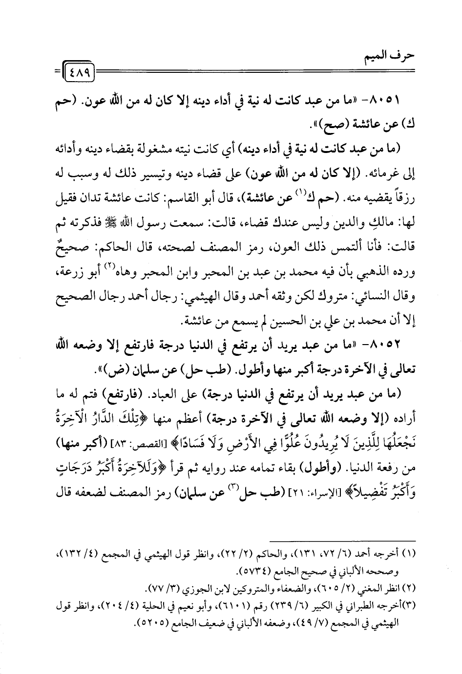 8051 - "ما من عبد كانت له نية في أداء دينه إلا كان له من الله عون. (حم ك) عن عائشة (صح) ".