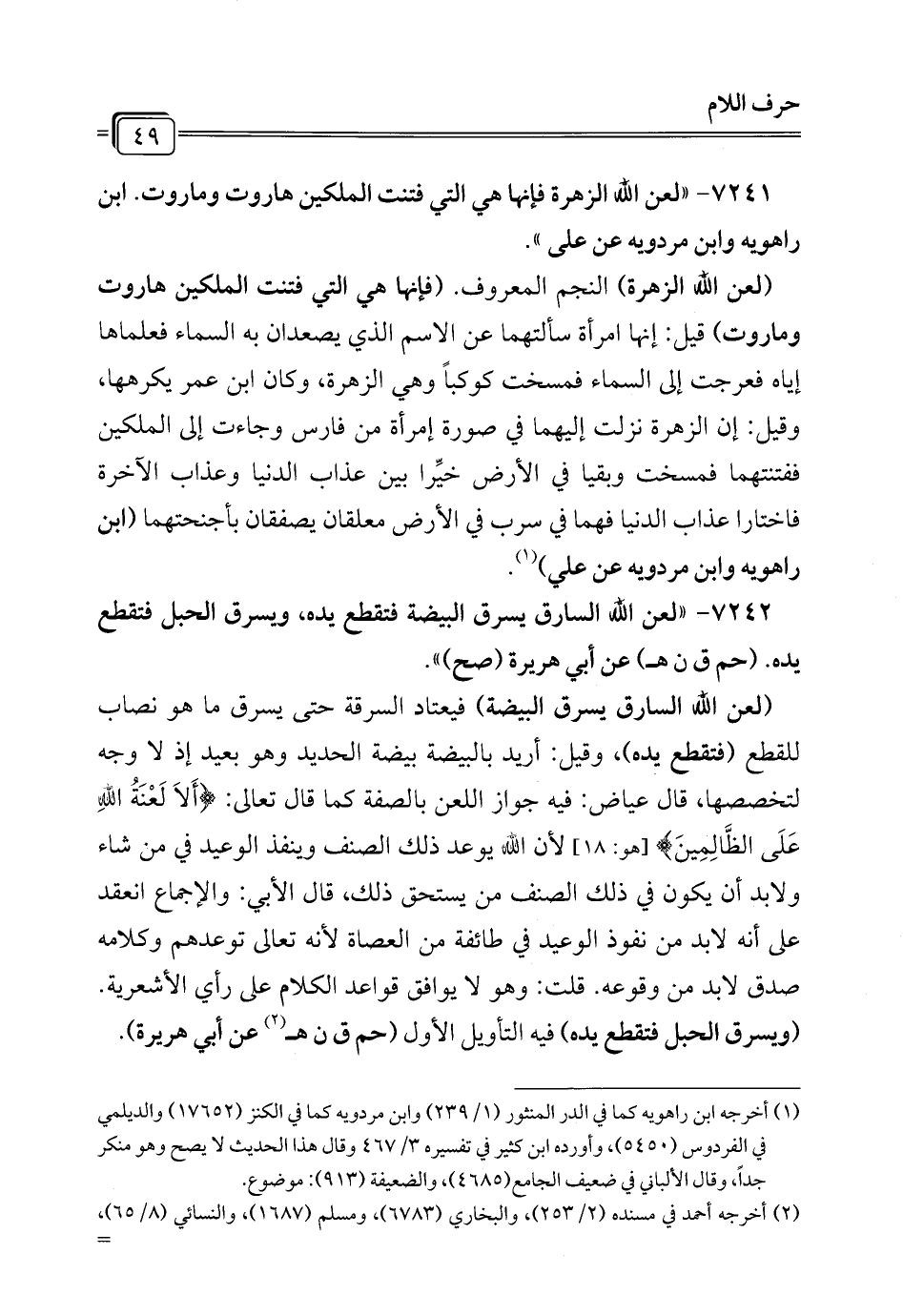 7241 - "لعن الله الزهرة فإنها هي التي فتنت الملكين هاروت وماروت. ابن راهويه وابن مردويه عن علي".