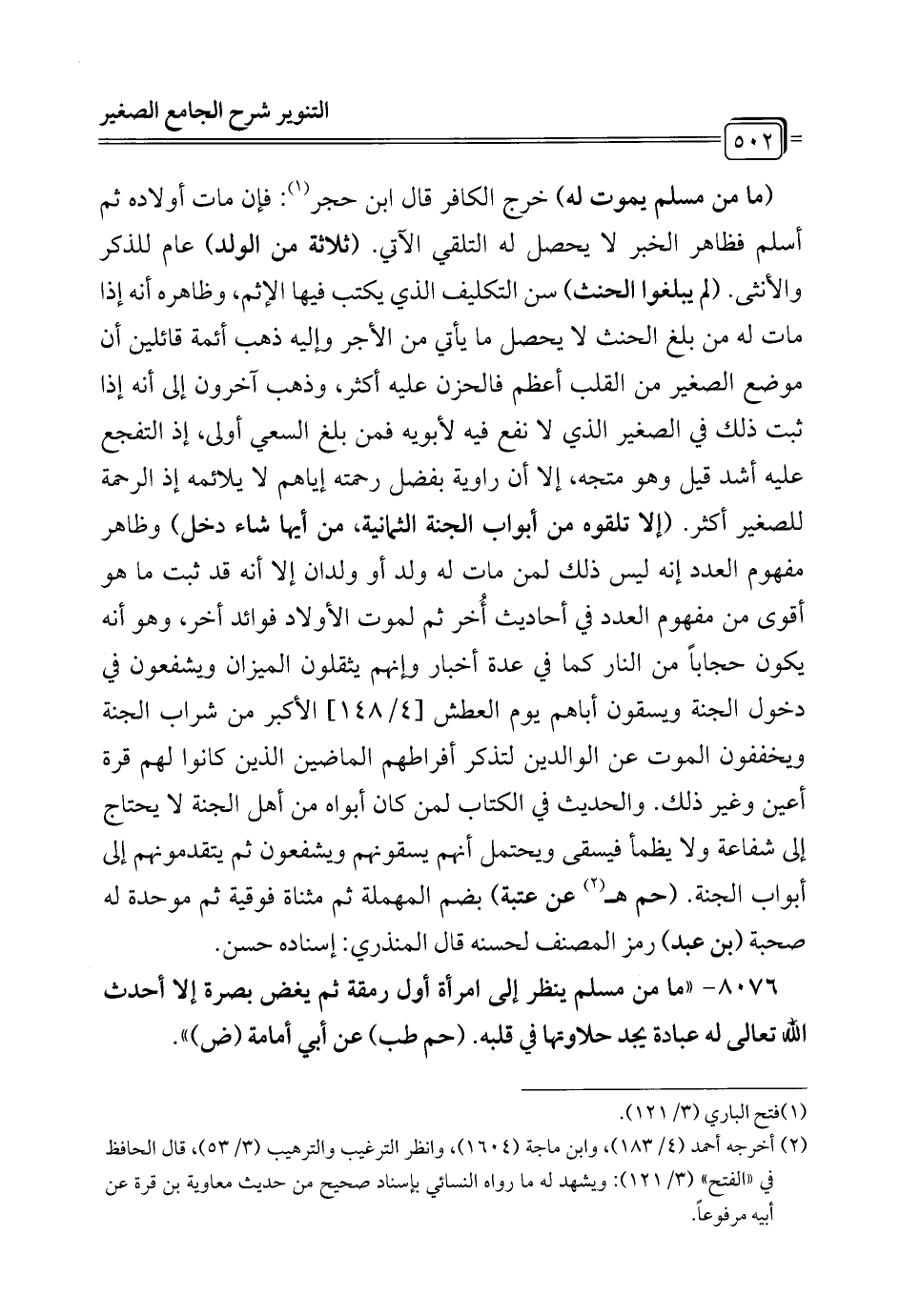 (ما من مسلم يموت له) خرج الكافر قال ابن حجر (¬1): فإن مات أولاده ثم أسلم فظاهر الخبر لا يحصل له التلقي الآتي. (ثلاثة من الولد) عام للذكر والأنثى. (لم يبلغوا الحنث) سن التكليف الذي يكتب فيها الإثم، وظاهره أنه إذا مات له من بلغ الحنث لا يحصل ما يأتي من الأجر وإليه ذهب أئمة قائلين أن موضع الصغير من القلب أعظم فالحزن عليه أكثر، وذهب آخرون إلى أنه إذا ثبت ذلك في الصغير الذي لا نفع فيه لأبويه فمن بلغ السعي أولى، إذ التفجع عليه أشد قيل وهو متجه، إلا أن راوية بفضل رحمته إياهم لا يلائمه إذ الرحمة للصغير أكثر. (إلا تلقوه من أبواب الجنة الثمانية من أيها شاء دخل) وظاهر مفهوم العدد إنه ليس ذلك لمن مات له ولد أو ولدان إلا أنه قد ثبت ما هو أقوى من مفهوم العدد في أحاديث أُخر ثم لموت الأولاد فوائد أخر، وهو أنه يكون حجاباً من النار كما في عدة أخبار وإنهم يثقلون الميزان ويشفعون في دخول الجنة ويسقون أباهم يوم العطش [4/ 148] الأكبر من شراب الجنة ويخففون الموت عن الوالدين لتذكر أفراطهم الماضين الذين كانوا لهم قرة أعين وغير ذلك. والحديت في الكتاب لمن كان أبواه من أهل الجنة لا يحتاج إلى شفاعة ولا يظمأ فيسقى ويحتمل أنهم يسقونهم ويشفعون ثم يتقدمونهم إلى أبواب الجنة. (حم هـ (¬2) عن عتبة) بضم المهملة ثم مثناة فوقية ثم موحدة له صحبة (بن عبد) رمز المصنف لحسنه قال المنذري: إسناده حسن.