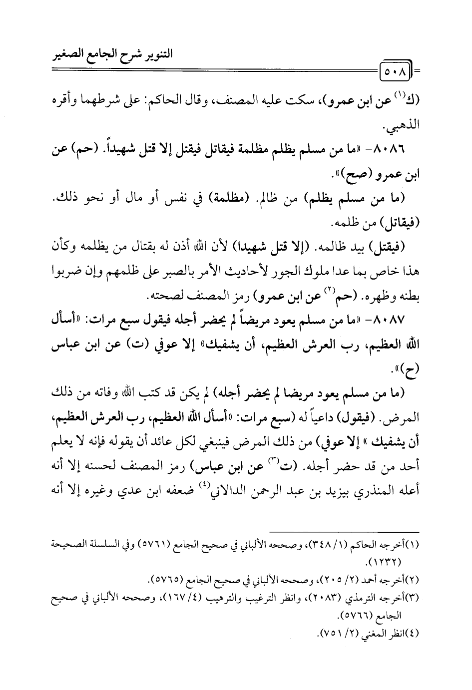 (ما من مسلم يعود مريضا لم يحضر أجله) لم يكن قد كتب الله وفاته من ذلك المرض. (فيقول) داعياً له (سبع مرات: "أسأل الله العظيم، رب العرش العظيم، أن يشفيك" إلا عوفي) من ذلك المرض فينبغي لكل عائد أن يقوله فإنه لا يعلم أحد من قد حضر أجله. (ت (¬3) عن ابن عباس) رمز المصنف لحسنه إلا أنه أعله المنذري بيزيد بن عبد الرحمن الدالاني (¬4) ضعفه ابن عدي وغيره إلا أنه