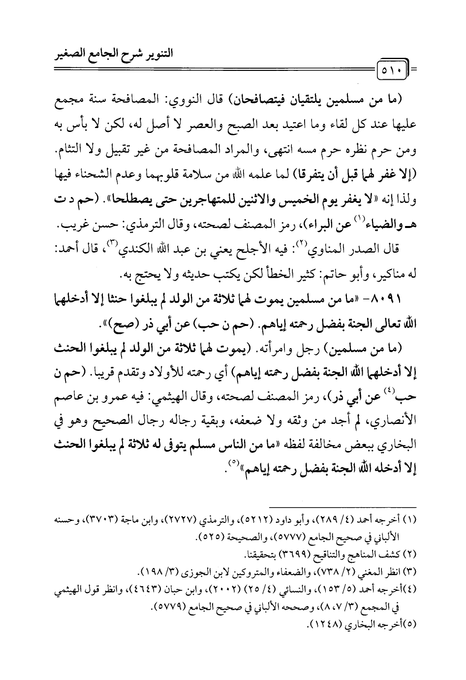 (ما من مسلمين يلتقيان فيتصافحان) قال النووي: المصافحة سنة مجمع عليها عند كل لقاء وما اعتيد بعد الصبح والعصر لا أصل له، لكن لا بأس به ومن حرم نظره حرم مسه انتهى، والمراد المصافحة من غير تقبيل ولا التثام. (إلا غفر لهما قبل أن يتفرقا) لما علمه الله من سلامة قلوبهما وعدم الشحناء فيها ولذا إنه "لا يغفر يوم الخميس والاثنين للمتهاجرين حتى يصطلحا". (حم د ت هـ والضياء (¬1) عن البراء)، رمز المصنف لصحته، وقال الترمذي: حسن غريب.