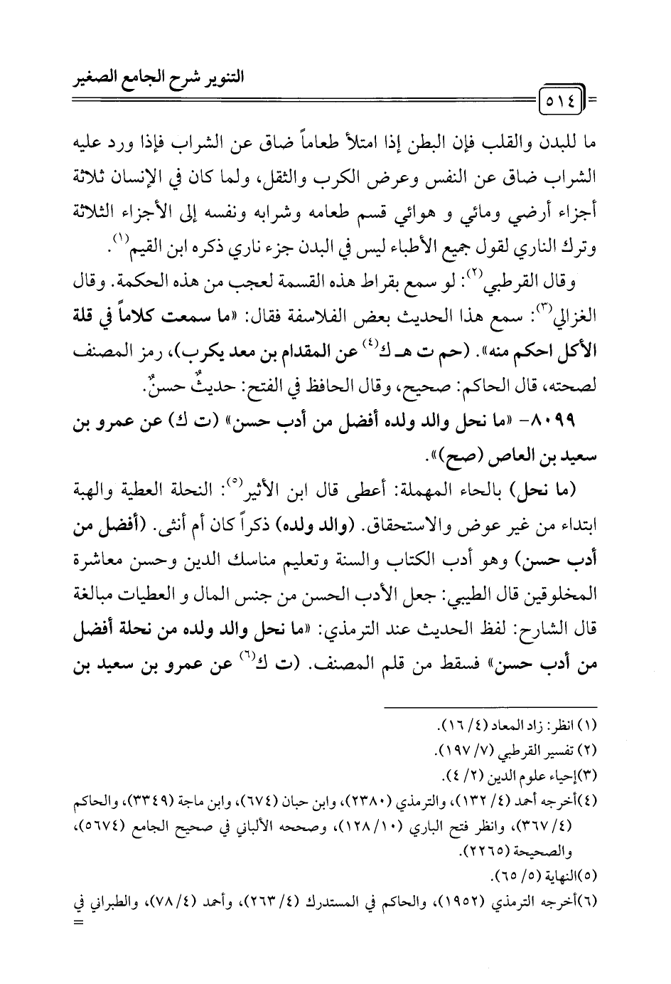 8099 - "ما نحل والد ولده أفضل من أدب حسن" (ت ك) عن عمرو بن سعيد بن العاص (صح) ".